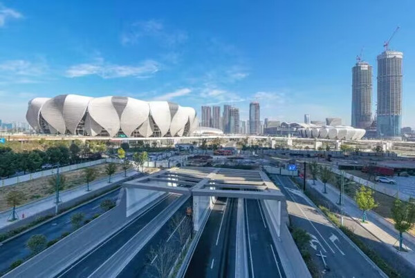 奥体隧道(又名滨盛路隧道)全长约1738米,下穿飞虹路、杭州奥体博览城(核心区)、博奥路,是杭州奥体博览城(核心区)主要配套道路之一。整个隧道,最大的特色就是贯穿整个杭州奥体博览城,与奥体中心主体育场(大莲花)、国际博览中心及体育游泳馆地下二层车库相连,连起“大小莲花”。